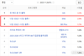 케이블 종합 전국 시청률 4.1%로 1위, 수도권 합산 4.162% '나는 SOLO' 229회 11월 26일 방송 시청률이 발표됐다. 네이버가 발표한 닐슨 코리아의 전국 시청률 조사에 따르면 '나는 SOLO'는 케이블 종합 순위에서 4.1%(합산)를 기록하였다. 채널 별로는 ENA 2.4%(2위), SBS Plus 1.7%(3위)를 각각 기록했다. 수도권 시청률은 각각 1.811%(SBS Plus)와 2.351%(ENA)를 기록하여 합산 시청률은 4.162%였다. 분당 최고 시청률은 4.7%까지 치솟았다. ‘최고의 1분’은 솔로남들의 '자기소개 타임' 장면이 차지했다. 2049 시청률 1.740%로 동시간대 1위 '나는 SOLO'의 '2049 시청률'은 양쪽 방송사 합산 1.740%로 1위를 차지했다. 이는 '나는 SOLO'가 구매력이 가장 높은 연령층이 즐겨보는 프로그램이라는 것을 보여주고 있다. '나는 SOLO'는 결혼을 간절히 원하는 솔로 남녀들이 모여 사랑을 찾기 위해 고군분투하는 극사실주의 데이팅 프로그램으로 2021년 7월 14일부터 ENA와 SBS Plus를 통해 주 1회 방송되고 있다. 현재 29기가 방송되고 있다.