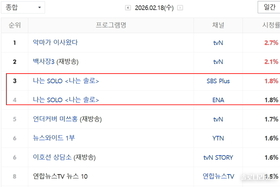 케이블 종합 전국 시청률 3.6%로 1위, 수도권 합산 3.501% '나는 SOLO' 240회 2월 18일 방송 시청률이 발표됐다. 네이버가 발표한 닐슨 코리아의 전국 시청률 조사에 따르면 '나는 SOLO'는 케이블 종합 순위에서 3.6%(합산)를 기록하여 종합 순위 1위에 올랐다. 채널 별로는 ENA 1.8%(4위), SBS Plus 1.8%(3위)를 각각 기록했다. 수도권 시청률은 각각 1.182%(SBS Plus)와 1.681%(ENA)를 기록하여 합산 시청률은 3.501%였다. 분당 최고 시청률은 4.6%까지 올라갔다. 분당 최고 시청률은 4.05%였다. ‘최고의 1분’은 영숙이 영호에게 피로회복제를 선물하는 장면이 차지했다. 2049 시청률 1.352%로 동시간대 2위 '나는 SOLO'의 '2049 시청률'은 양쪽 방송사 합산 1.352%로 JTBC의 '한문철의 블랙박스 리뷰-2026밀라노 동계 올림픽(2.748%)'에 이어 동시간대 2위를 차지했다. 이는 '나는 SOLO'가 구매력이 가장 높은 연령층이 즐겨보는 프로그램이라는 것을 보여주고 있다. '나는 SOLO'는 결혼을 간절히 원하는 솔로 남녀들이 모여 사랑을 찾기 위해 고군분투하는 극사실주의