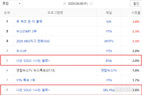 수도권 합산 3.474%, 케이블 종합 전국 시청률 3.6%로 2위 '나는 SOLO' 248회 4월 8일 방송 시청률이 발표됐다. 네이버가 발표한 닐슨 코리아의 전국 시청률 조사에 따르면 '나는 SOLO'는 케이블 종합 순위에서 3.6%(합산)를 기록하여 종합 순위 2위에 올랐다. 채널 별로는 ENA 2.0%(5위), SBS Plus 1.6%(8위)를 각각 기록했다. 수도권 시청률은 각각 1.629%(SBS Plus)와 1.845%(ENA)를 기록하여 합산 시청률은 3.474%였다. 분당 최고 시청률은 4.15%였다. ‘최고의 1분’은 31기의 자기소개 타임이 모두 끝나는 장면이 차지했다. 2049 시청률 2.044%로 동시간대 1위 '나는 SOLO'의 '2049 시청률'은 양쪽 방송사 합산 2.044%로 MBC의 '라디오스타(1.102%)'를 누르고 동시간대 1위를 차지했다. 이는 '나는 SOLO'가 구매력이 가장 높은 연령층이 즐겨보는 프로그램이라는 것을 보여주고 있다. '나는 SOLO'는 결혼을 간절히 원하는 솔로 남녀들이 모여 사랑을 찾기 위해 고군분투하는 극사실주의 데이팅 프로그램으로 2021년 7월 14일부터 ENA와 SBS Plus를 통해 주 1