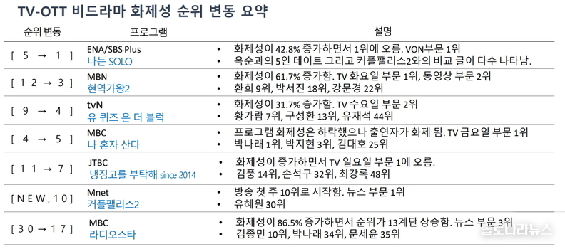 TV와 OTT를 합친 화제성 상위 5편 안에도 비드라마로는 유일하게 '나는 SOLO'가 4위에 이름을 올렸다. OTT를 제외하면 '나의 완벽한 비서' 다음인 2위다.