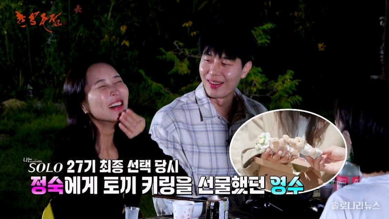 두 사람은 주방에서 다 같이 먹을 라면을 끓이고 설거지를 하면서 다정한 모습을 보여주었다. 뿐만 아니라 정숙은 ‘솔로나라’에서 “영수가 선물한 토끼 키링을 달고 나올 뻔했다”고 말해, 정숙의 마음속에서도 영수가 완전히 사라진 것은 아닌 듯한 인상을 주었다.