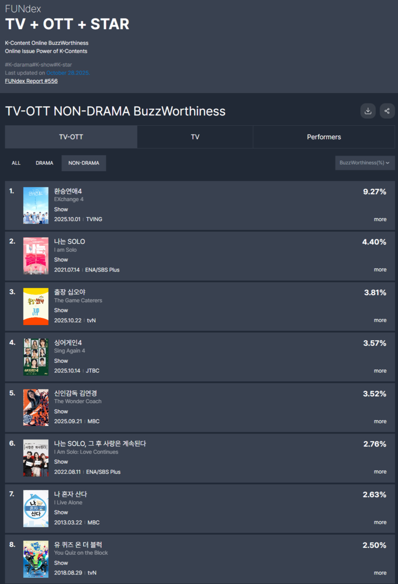 또한, '나는 SOLO, 그 후 사랑은 계속된다'는 굿데이터코퍼레이션이 10월 28일 발표한 TV-OTT 비드라마 화제성 지수 6위를 기록했다. K-콘텐츠 경쟁력 분석 전문 기관인 굿데이터코퍼레이션이 한 주간 가장 경쟁력 있는 프로그램을 선정하기 위해 발표하는 화제성 지수는 뉴스기사, VON(Voice of Netizen), 동영상(영상클립 및 숏츠), SNS에서 발생한 프로그램 관련 정보들과 이에 대한 네티즌 반응을 분석한 결과이다. 조사를 위해 수집된 자료 가운데 프로그램과 관련 없는 자료, 화제성 점수를 의도적으로 올리기 위한 어뷰징 자료는 필터링 단계를 통해 처리된다. 이 과정을 통해 프로그램 경쟁력이 보다 정확하게 분석되고 있으며 정확도는 97%이상이다.