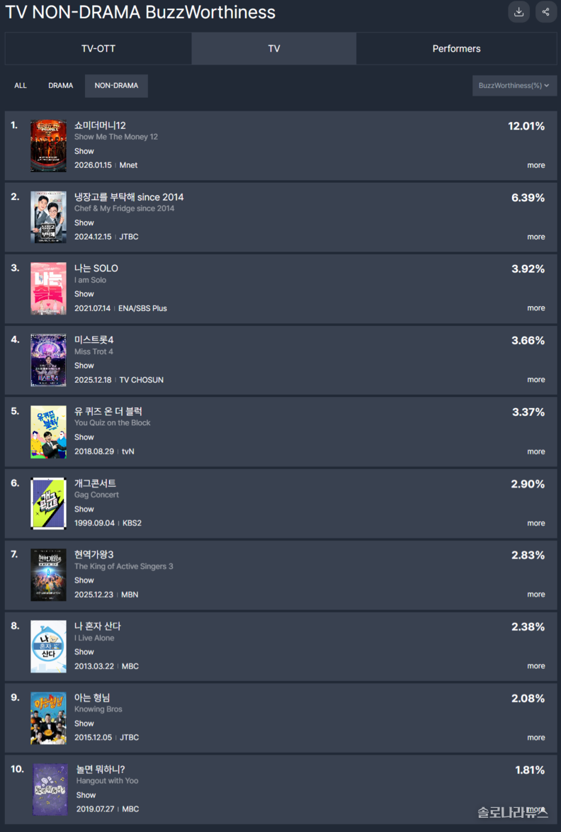 또한 굿데이터 코퍼레이션에서 집계하는 ‘펀덱스 차트’(1월 20일 발표)에서 ‘TV 비드라마 화제성’ 3위에 올라 식을 줄 모르는 인기를 과시했다. K-콘텐츠 경쟁력 분석 전문 기관인 굿데이터코퍼레이션이 한 주간 가장 경쟁력 있는 프로그램을 선정하기 위해 발표하는 화제성 지수는 뉴스기사, VON(Voice of Netizen), 동영상(영상클립 및 숏츠), SNS에서 발생한 프로그램 관련 정보들과 이에 대한 네티즌 반응을 분석한 결과이다. 조사를 위해 수집된 자료 가운데 프로그램과 관련 없는 자료, 화제성 점수를 의도적으로 올리기 위한 어뷰징 자료는 필터링 단계를 통해 처리된다. 이 과정을 통해 프로그램 경쟁력이 보다 정확하게 분석되고 있으며 정확도는 97%이상이다.
