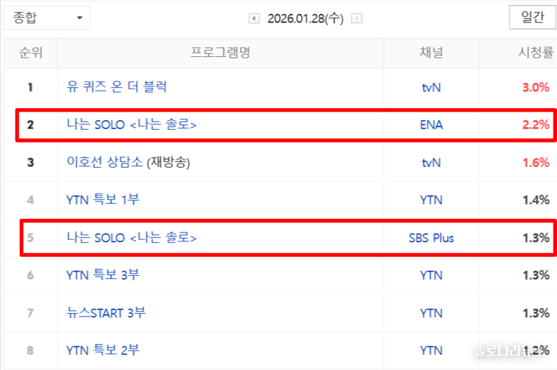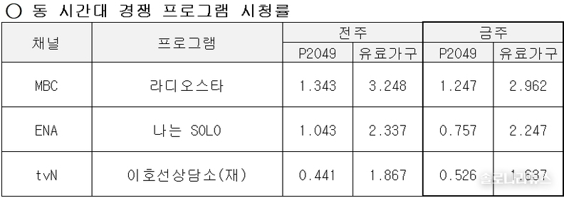 '나는 SOLO'의 '2049 시청률'은 양쪽 방송사 합산 1.250%로 MBC의 '라디오스타' 1.274%를 제치고 동시간대 1위를 차지했다. 이는 '나는 SOLO'가 구매력이 가장 높은 연령층이 즐겨보는 프로그램이라는 것을 보여주고 있다.