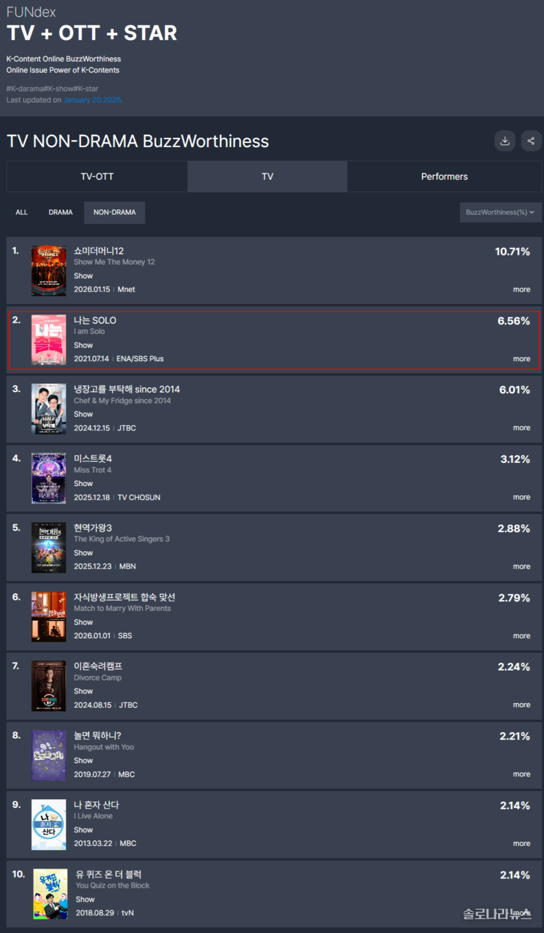 또한 굿데이터 코퍼레이션에서 집계하는 ‘펀덱스 차트’(1월 20일 발표)에서 ‘TV 비드라마 화제성’ 2위에 올라 탄탄한 인기와 화제성을 과시했다. K-콘텐츠 경쟁력 분석 전문 기관인 굿데이터코퍼레이션이 한 주간 가장 경쟁력 있는 프로그램을 선정하기 위해 발표하는 화제성 지수는 뉴스기사, VON(Voice of Netizen), 동영상(영상클립 및 숏츠), SNS에서 발생한 프로그램 관련 정보들과 이에 대한 네티즌 반응을 분석한 결과이다. 조사를 위해 수집된 자료 가운데 프로그램과 관련 없는 자료, 화제성 점수를 의도적으로 올리기 위한 어뷰징 자료는 필터링 단계를 통해 처리된다. 이 과정을 통해 프로그램 경쟁력이 보다 정확하게 분석되고 있으며 정확도는 97%이상이다.