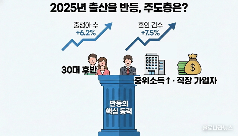 저출산위가 국민대학교 계봉오 교수팀과 함께 건강보험 행정자료를 분석한 결과, 이번 반등의 결정적 요인은 '유배우 출산율(배우자가 있는 여성의 출산율)' 상승인 것으로 나타났다. 특히 30대 여성, 그중에서도 30대 후반(35~39세)의 출산율 증가가 전체 상승을 견인했다. 소득 및 고용 형태별로는 중위소득 이상 가구와 고용 기반이 안정적인 건강보험 직장 가입자 중심으로 출산이 늘어난 것으로 분석됐다.