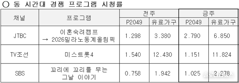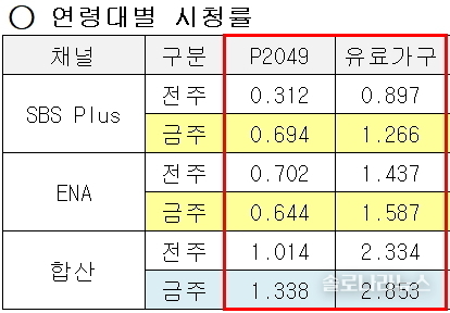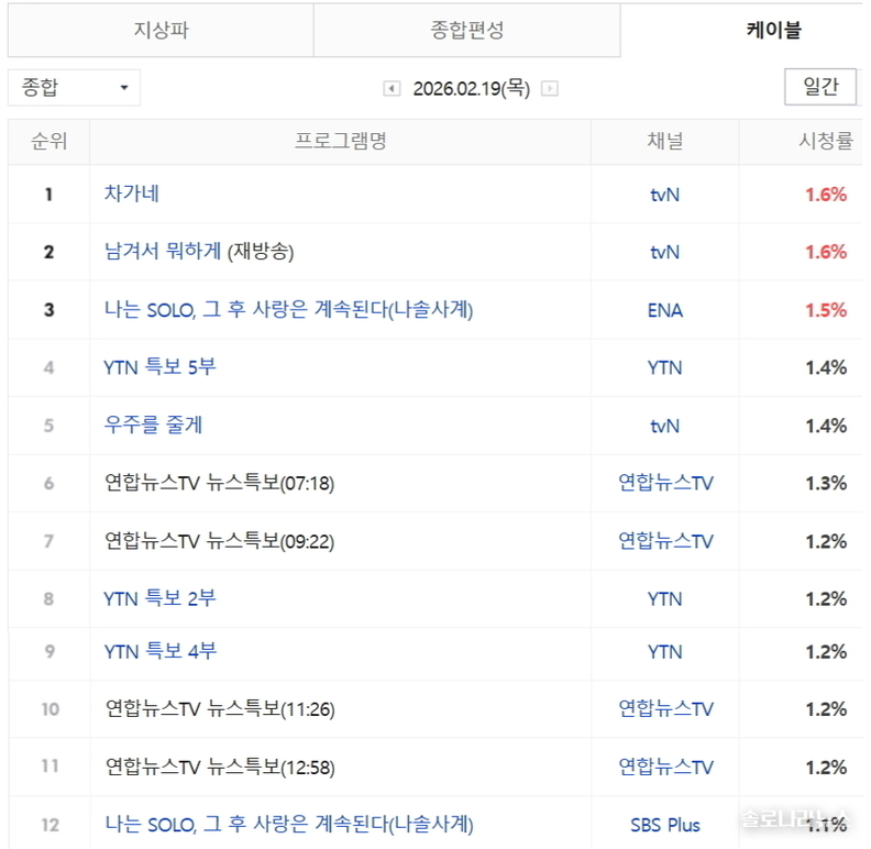 케이블 종합 전국 시청률 2.6%로 1위, 수도권 합산 2.853%