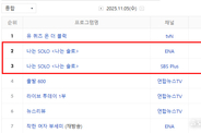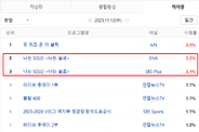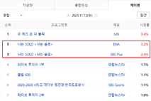 케이블 종합 전국 시청률 5.6%로 1위, 수도권 합산 5.819% '나는 SOLO' 227회 11월 12일 방송 시청률이 발표됐다. 네이버가 발표한 닐슨 코리아의 전국 시청률 조사에 따르면 '나는 SOLO'는 케이블 종합 순위에서 5.6%(합산)를 기록하였다. 채널 별로는 ENA 3.2%(2위), SBS Plus 2.4%(3위)를 각각 기록했다. 수도권 시청률은 각각 2.361%(SBS Plus)와 3.458%(ENA)를 기록하여 합산 시청률은 5.819%였다. 분당 최고 시청률은 무려 6.5%까지 치솟았다. ‘최고의 1분’은 상철이가 순자한테 “선 넘지 말라”고 경고한 뒤, 다시 순자를 찾아가 대화에 나서는 장면이었다. 2049 시청률 2.938%로 동시간대 1위 '나는 SOLO'의 '2049 시청률'은 양쪽 방송사 합산 2.938%로 1위를 차지했다. 이는 '나는 SOLO'가 구매력이 가장 높은 연령층이 즐겨보는 프로그램이라는 것을 보여주고 있다. TV-OTT 비드라마 화제성 부문 2위 또한, '나는 SOLO'는 굿데이터코퍼레이션이 11월 11일 발표한 TV-OTT 비드라마 화제성 지수 2위를 기록했다. K-콘텐츠 경쟁력 분석 전문 기관인 굿데이터코퍼레