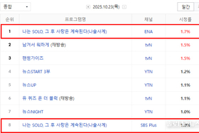 최고의 1분은 '남자 출연자들이 여자들을 앞에 두고 본인들끼리 이야기하는 장면' 10월 23일(목) 방송한 ENA와 SBS Plus의 ‘나는 SOLO, 그 후 사랑은 계속된다’(이하 ‘나솔사계’)는 닐슨코리아 집계 결과(수도권), 각각 0.858%(SBS Plus)와 1.491%(ENA)를 기록하여 수도권 합산 시청률은 2.349%를 기록했다. 분당 최고 시청률은 3.01%까지 올라갔는데 ‘최고의 1분’은 장미가 등장한 후 용담이 나오기 전까지 남자 출연자들이 여자들을 앞에 두고 본인들끼리 대화하는 장면이 차지했다. 케이블 전국 시청률 합산 1위 네이버가 발표한 닐슨 코리아의 전국 시청률 조사에 따르면 ‘나는 SOLO, 그 후 사랑은 계속된다’(이하 ‘나솔사계’)는 케이블 시청률 예능 순위에서 2.7%(합산)를 기록하며 1위를 차지했다. '나솔사계' 주요 타깃인 '여성2549 시청률' 1.618% 또한, ‘나솔사계’의 타깃인 ‘2049 시청률’은 1.088%였으며 '2049 시청률'은 광고주들이 가장 중요하게 생각하는 20세부터 49세까지 연령대 시청률을 조사한 시청률이다. '여성2549 시청률'은 1.618%를 기록하였다. '나는 SOLO, 그 후 사랑은