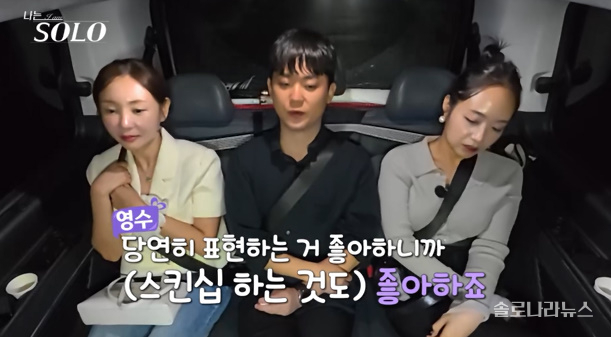 정숙-순자와 ‘2:1 데이트’에 돌입한 영수는 식당으로 가는 차 안에서 국제학교 경험을 언급하며 볼에 입을 맞추는 ‘비쥬’에 대해 얘기했다. 그러자 순자는 “우리도 한번 할까요?”라고 장난쳤으며, 영수는 “저랑 하시게요?”라며 “전 뽀뽀를 좋아한다, 참고하시라”고 능청스레 말했다. 분위기가 후끈 달아오른 가운데, 식당에 도착한 영수는 “이런 글로벌 시대엔 3개 국어 할 줄 아는 남자를 만나는 게 좋다”고, ‘한국어-영어-중국어’에 능통한 자신을 적극 어필했다. 뒤이어 ‘1:1 데이트’에 나선 영수는 정숙에게 ‘장거리’ 이슈에 대해 물었다. 그는 “이 회사에 있는 한은 (근무지를) 옮기는 게 힘들다”고 밝혔고, 정숙은 씁쓸한 미소와 함께, “자기소개를 일목요연하게 잘 하시고, 해외 경험이 있는 것도 좋았다”고 호감을 표현했다. 영수는 “말씀하시는 것만 들으면 이상형을 만난 거네. 우리 관계에 있어서 가장 큰 장애물은 장거리”라고 정리했다. 다음으로 순자와 ‘1:1 데이트’에 들어간 영수는 “중국어로 저한테 한마디 해 달라”는 순자의 요청에 “황당하네~”라며 진땀을 흘렸다. 데이트 후 순자는 제작진과의 인터뷰에서 “영수님이 저한테 많이 넘어온 거 같다”며 앞서가는 모습을 보인 반면, 영수는 “옥순-영숙 님에 대한 궁금증이 가장 크고, 순자 님보다는 정숙 님에게 호감이 좀 더 있다”고 밝혔다.