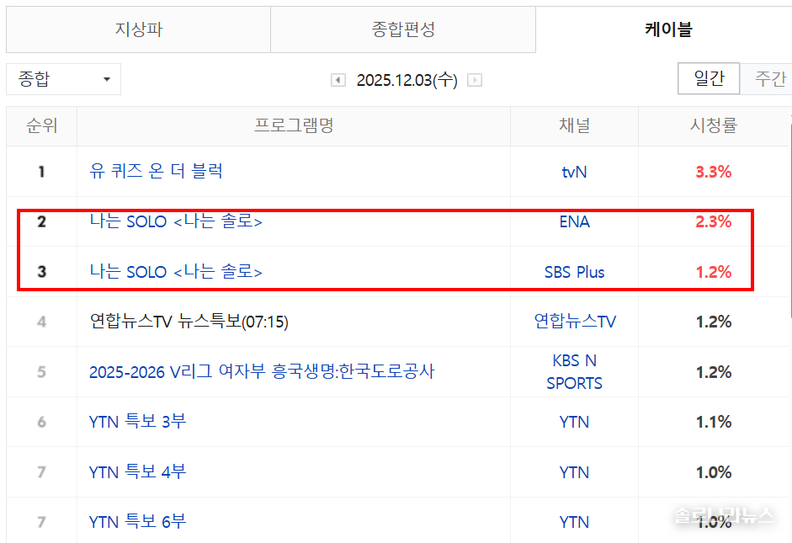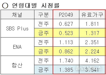 케이블 종합 전국 시청률 3.5%로 1위, 수도권 합산 3.541%