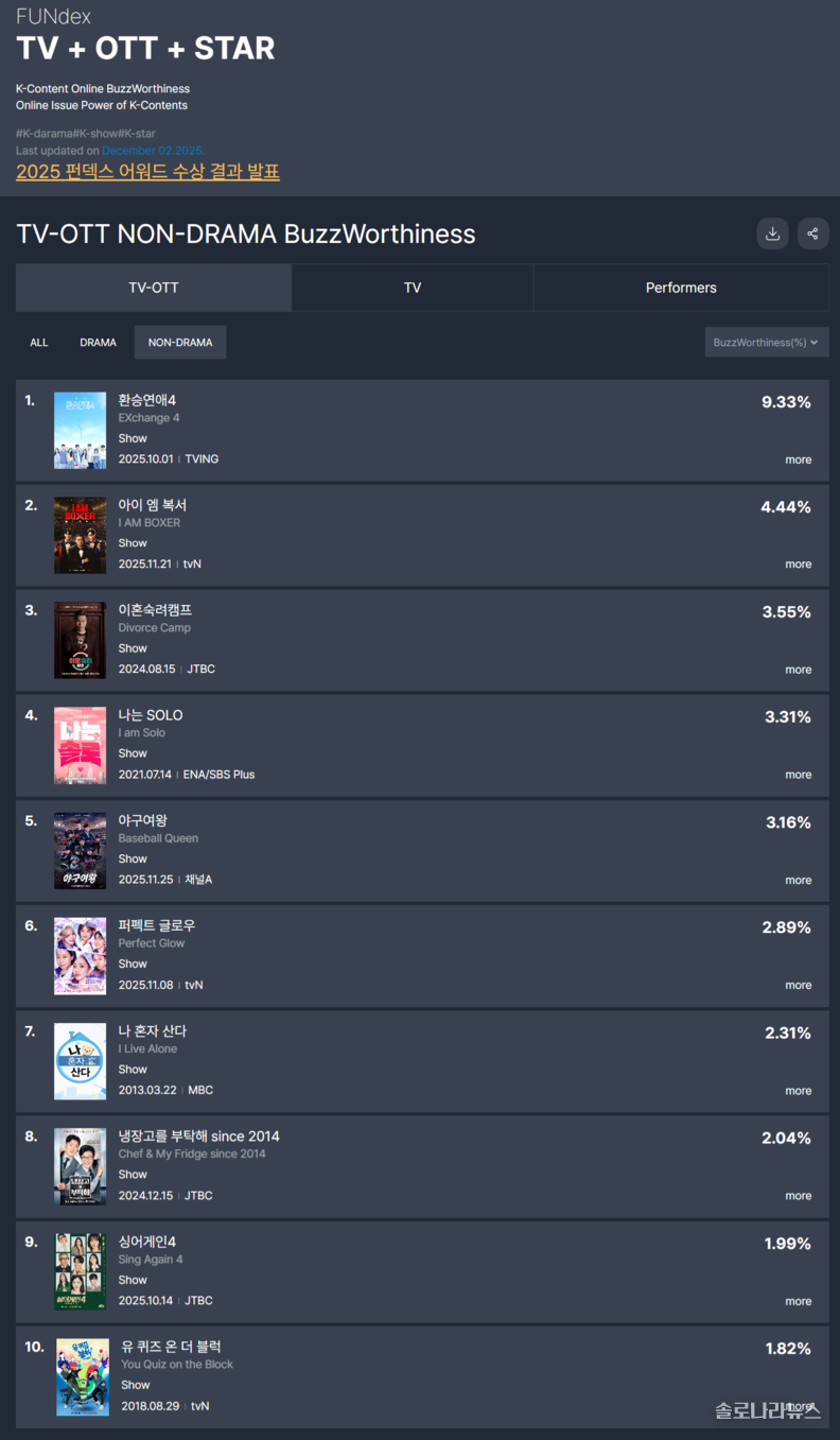 또한, '나는 SOLO'는 굿데이터코퍼레이션이 12월 2일 발표한 TV-OTT 비드라마 화제성 지수 4위를 기록했다. K-콘텐츠 경쟁력 분석 전문 기관인 굿데이터코퍼레이션이 한 주간 가장 경쟁력 있는 프로그램을 선정하기 위해 발표하는 화제성 지수는 뉴스기사, VON(Voice of Netizen), 동영상(영상클립 및 숏츠), SNS에서 발생한 프로그램 관련 정보들과 이에 대한 네티즌 반응을 분석한 결과이다. 조사를 위해 수집된 자료 가운데 프로그램과 관련 없는 자료, 화제성 점수를 의도적으로 올리기 위한 어뷰징 자료는 필터링 단계를 통해 처리된다. 이 과정을 통해 프로그램 경쟁력이 보다 정확하게 분석되고 있으며 정확도는 97%이상이다.