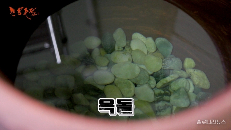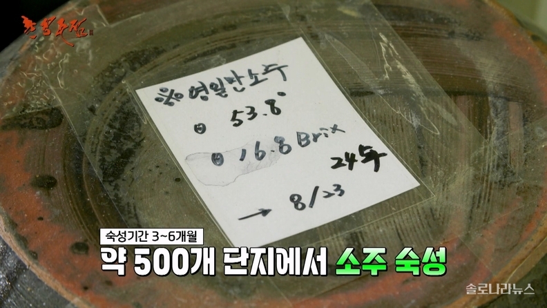 양조장에는 약 500개의 항아리가 있었는데, 각각의 항아리 속에서 소주가 3개월에서 6개월 동안 숙성된다. 숙성 과정에서 도수는 낮아지고 맛은 한층 부드러워지기 때문이라고 한다. 정 사장은 항아리를 열며 “작년 8월에 담근 술”이라 소개했고, 그 안에는 ‘옥’을 넣어 숙성한 특별한 소주가 있었다.
