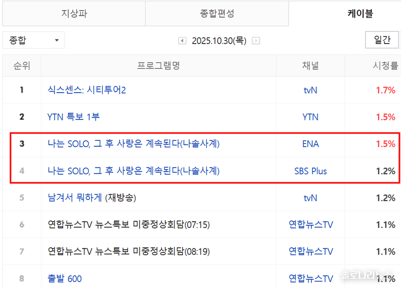 네이버가 발표한 닐슨 코리아의 전국 시청률 조사에 따르면 ‘나는 SOLO, 그 후 사랑은 계속된다’(이하 ‘나솔사계’)는 케이블 시청률 예능 순위에서 2.7%(합산)를 기록하며 1위를 차지했다.
