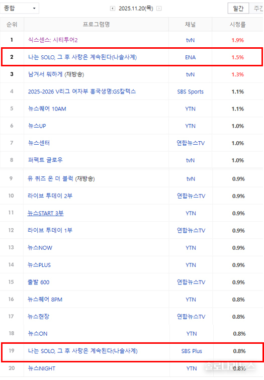 네이버가 발표한 닐슨 코리아의 전국 시청률 조사에 따르면 ‘나는 SOLO, 그 후 사랑은 계속된다’(이하 ‘나솔사계’)는 케이블 시청률 예능 순위에서 2.3%(합산)를 기록하며 1위를 차지했다.