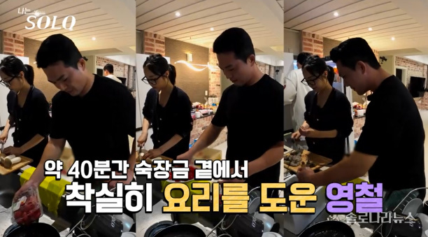 ‘솔로나라’에서의 4일 차 밤, 정숙은 “감바스 재료가 너무 많다”며 공용 주방에서 ‘숙장금’으로 변신해 폭풍 칼질을 선보였다. 영철은 “칼 소리가 진짜 듣기 좋다”고 감탄하며 정숙의 옆에서 ‘보조 셰프’ 노릇을 톡톡히 했다. 비슷한 시각, 상철은 옥순을 불러내 여전히 ‘1:1 데이트’를 원하고 있음을 어필했다. 옥순은 “제 1, 2순위에 없는 걸 아시는데도 그러시는 거냐?”고 물었지만, 상철이 쉽게 단념할 뜻을 보이지 않자 옥순은 “그냥 상철 님 하고 싶은 대로 하셔라”고 말했다.