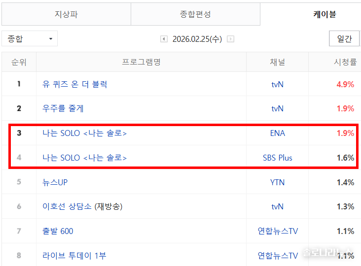 '나는 SOLO' 242회 2월 25일 방송 시청률이 발표됐다. 네이버가 발표한 닐슨 코리아의 전국 시청률 조사에 따르면 '나는 SOLO'는 케이블 종합 순위에서 3.5%(합산)를 기록하여 종합 순위 2위에 올랐다. 채널 별로는 ENA 1.8%(3위), SBS Plus 1.6%(4위)를 각각 기록했다. 수도권 시청률은 각각 1.553%(SBS Plus)와 1.629%(ENA)를 기록하여 합산 시청률은 3.182%였다. 분당 최고 시청률은 4.6%까지 올라갔다. 분당 최고 시청률은 3.96%였다. ‘최고의 1분’은 영철-정숙이 야식 데이트로 뜻밖의 케미를 확인한 장면이 차지했다.
