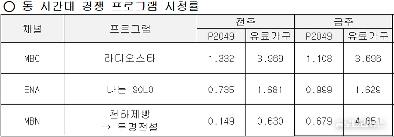 '나는 SOLO'의 '2049 시청률'은 양쪽 방송사 합산 1.778%로 MBC의 '라디오 스타(1.108%)'를 누르고 동시간대 1위를 차지했다. 이는 '나는 SOLO'가 구매력이 가장 높은 연령층이 즐겨보는 프로그램이라는 것을 보여주고 있다.