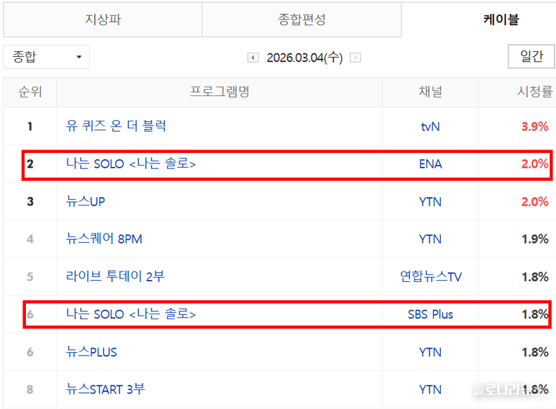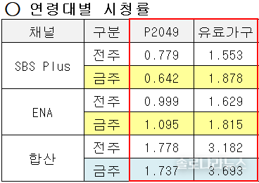 케이블 종합 전국 시청률 3.8%로 2위, 수도권 합산 3.693%