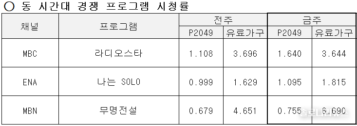 '나는 SOLO'의 '2049 시청률'은 양쪽 방송사 합산 1.737%로 MBC의 '라디오 스타(1.640%)'를 누르고 동시간대 1위를 차지했다. 이는 '나는 SOLO'가 구매력이 가장 높은 연령층이 즐겨보는 프로그램이라는 것을 보여주고 있다.