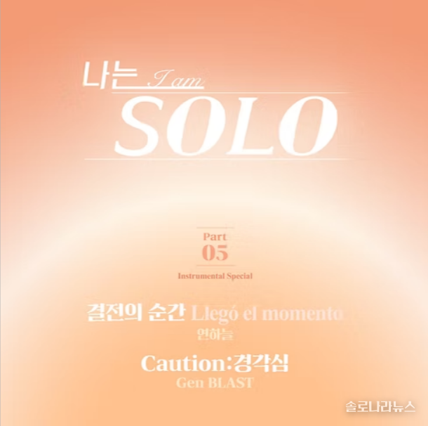 '나는 SOLO'의 감정선을 완성하는 새로운 음악들이 찾아온다. OST 제작사 칠리뮤직코리아는 3월 5일(목) 정오, '나는 SOLO' OST 파트 5 ‘Instrumental Special’을 전격 공개한다고 밝혔다. 이번 싱글에는 아르헨티나 현지에서 실력을 쌓은 탱고 뮤지션 연하늘의 ‘결전의 순간(Llegó el momento)’과 일본의 일렉트로닉 아티스트 겐 블라스트(Gen BLAST)의 ‘Caution: 경각심’ 등 총 2개의 연주곡 트랙이 수록됐다.