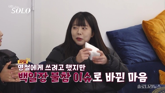 앞서 ‘데이트 동시 선택’에서 영수의 선택을 받지 못한 순자는 씁쓸하게 영수-옥순을 지나쳐 숙소로 돌아갔다. 이후 정숙, 영자, 현숙과 대화를 나누다 깜빡 잠이 든 순자는 영수와 대화를 마친 옥순이 숙소로 들어오자 서둘러 자리를 피했다.