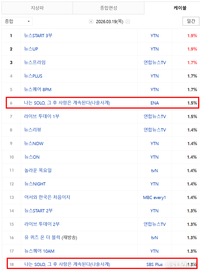 나는 SOLO, 그 후 사랑은 계속된다(이하 나솔사계)' 157회 3월 19일 방송 시청률이 발표됐다. 네이버가 발표한 닐슨 코리아의 전국 시청률 조사에 따르면 '나는 SOLO'는 케이블 종합 순위에서 2.8%(합산)를 기록하였다. 채널 별로는 ENA 1.5%(6위), SBS Plus 1.3%(18위)를 각각 기록했다. 수도권 시청률은 각각 1.063%(SBS Plus)와 1.289%(ENA)를 기록하여 합산 시청률은 2.352%였다. 분당 최고 시청률은 3.01%까지 올라갔다. ‘최고의 1분’은 솔로녀들이 첫 데이트 매칭 후기를 나누는 부분이 차지했다.