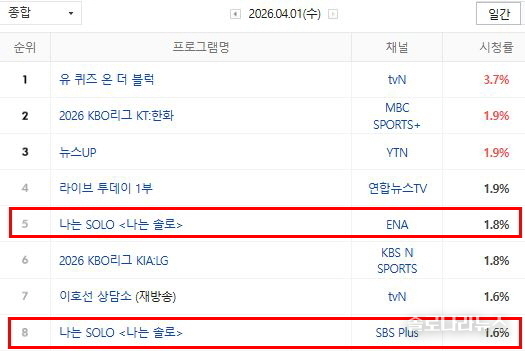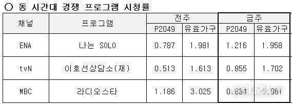 '나는 SOLO'의 '2049 시청률'은 양쪽 방송사 합산 1.893%로 tvN의 '이호선상담소(재) (0.855%)'를 누르고 동시간대 1위를 차지했다. 이는 '나는 SOLO'가 구매력이 가장 높은 연령층이 즐겨보는 프로그램이라는 것을 보여주고 있다.