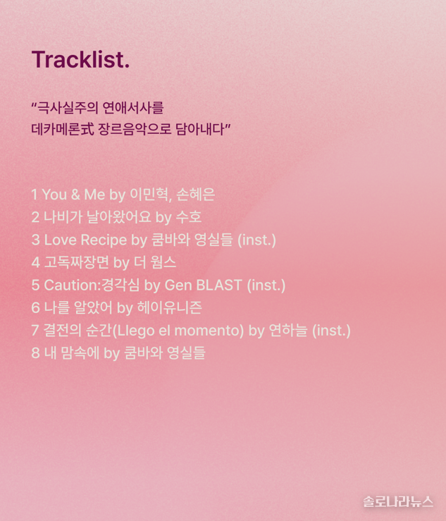 가창에는 엑소(EXO) 수호를 필두로 이민혁, 손혜은, 더 웜스, 헤이유니즌, 쿰바와 영실들 등 케이팝과 인디 씬을 아우르는 뮤지션들이 참여했다. 여기에 클래식 뮤지션 연하늘의 탱고 연주곡과 일본 뮤지션 겐 블라스트(Gen BLAST)의 일렉트로닉스 트랙까지 더해져, 케이팝·인디·제이팝·클래식을 하나의 앨범 안에 담아내는 이색적인 구성을 완성했다.