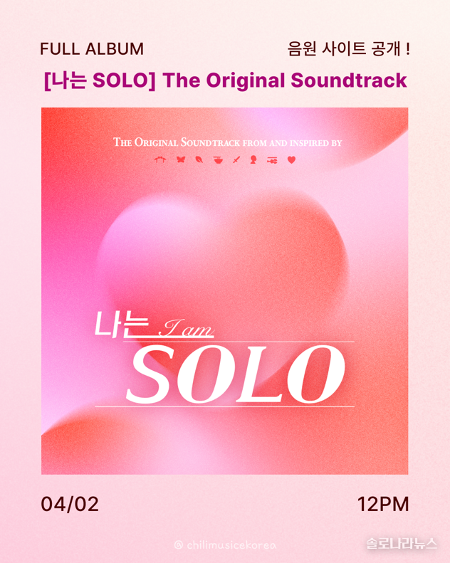 칠리뮤직코리아가 '나는 SOLO'의 오리지널 사운드트랙 풀앨범을 4월 2일(목) 정오 온라인으로 발표했다. 이번 OST는 출연자들의 연애서사를 하나하나 음악으로 풀어냈다.