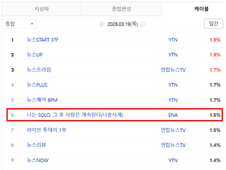 수도권 합산 4.109%, 케이블 종합 전국 시청률 3.9%로 2위 '나는 SOLO' 245회 3월 18일 방송 시청률이 발표됐다. 네이버가 발표한 닐슨 코리아의 전국 시청률 조사에 따르면 '나는 SOLO'는 케이블 종합 순위에서 3.9%(합산)를 기록하여 종합 순위 2위에 올랐다. 채널 별로는 ENA 2.0%(2위), SBS Plus 1.9%(3위)를 각각 기록했다. 수도권 시청률은 각각 1.832%(SBS Plus)와 2.277%(ENA)를 기록하여 합산 시청률은 4.109%였다. 분당 최고 시청률은 4.5%였다. ‘최고의 1분’은 영숙과 영호가 ‘슈퍼 데이트’를 시작하면서 언쟁을 벌이는 장면이 차지했다. 2049 시청률 1.858%로 동시간대 1위 '나는 SOLO'의 '2049 시청률'은 양쪽 방송사 합산 1.858%로 MBC의 '라디오 스타(1.387%)'를 누르고 동시간대 1위를 차지했다. 이는 '나는 SOLO'가 구매력이 가장 높은 연령층이 즐겨보는 프로그램이라는 것을 보여주고 있다. '나는 SOLO'는 결혼을 간절히 원하는 솔로 남녀들이 모여 사랑을 찾기 위해 고군분투하는 극사실주의 데이팅 프로그램으로 2021년 7월 14일부터 ENA와 SBS